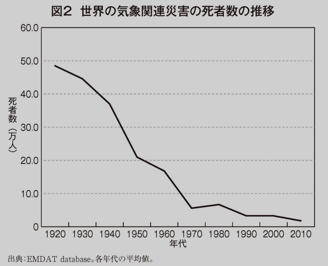 20世紀以降の世界全体の気象関連災害による死亡者数は、2010年代が最も少なくなっている。