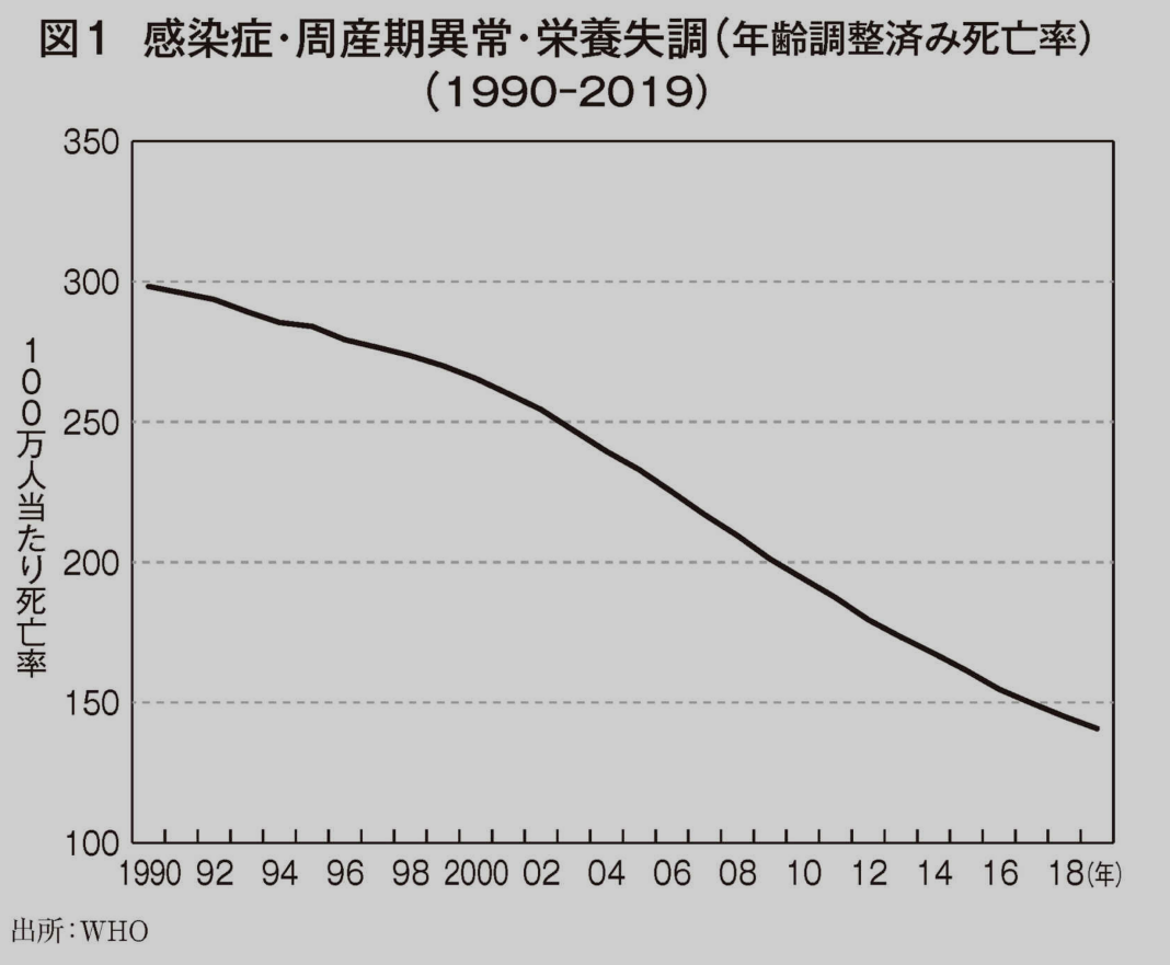 感染症・周産期異常・栄養失調による死者数は1990年から2019年までに1599万人から1019万人へと580万人も減少し、年齢調整済み死亡率は半分以下に低下している。
