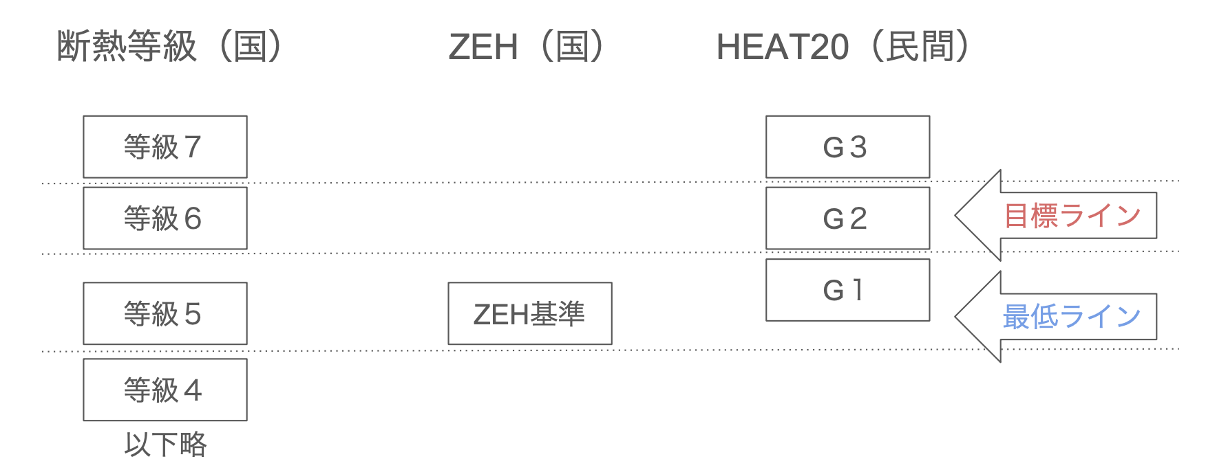 断熱等級やZEHというのは国が定めたもので、HEAT20というのは日本の民間機関が定めた基準です。