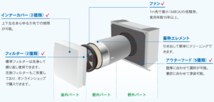 | 第一種換気システム | ダクトレス式 | 風量が弱い 導入コストは高い プロペラファンの音がちょっと気になる |