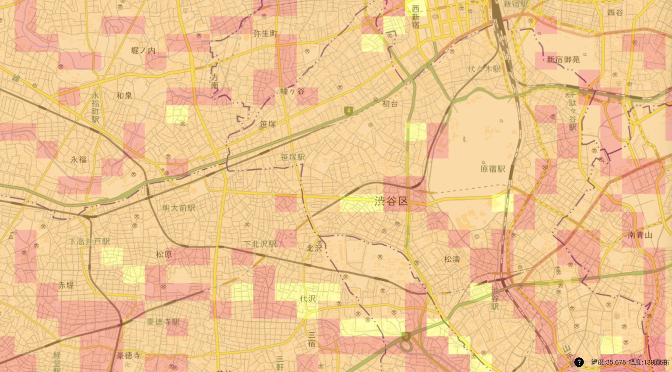 こんな感じで地盤の強さを色分けして表示してくれます。