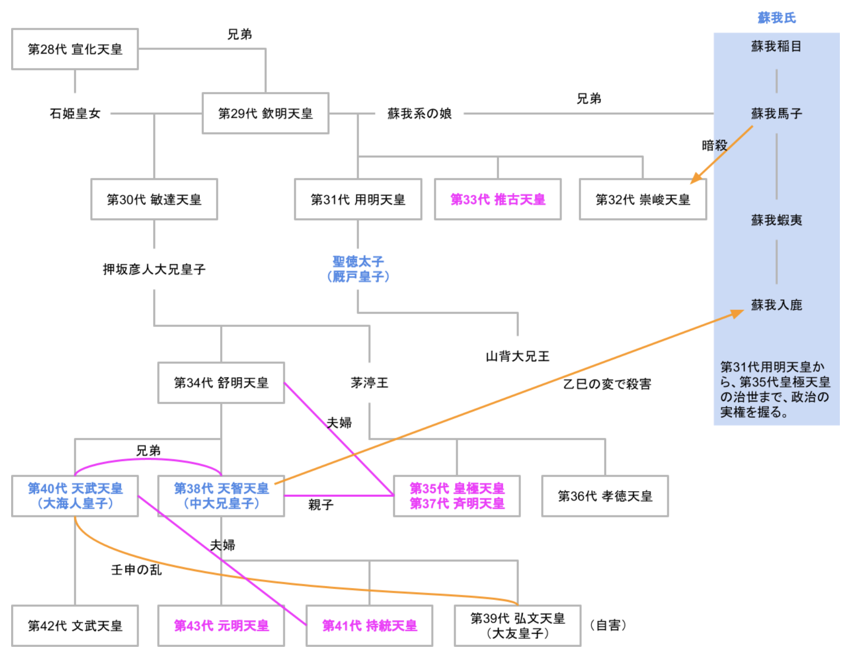 この時、中大兄皇子は数えで二十歳という若さであったため、三十歳未満での天皇即位は前例がないため、叔父にあたる軽皇子(孝徳天皇)へ皇位が継承されました。