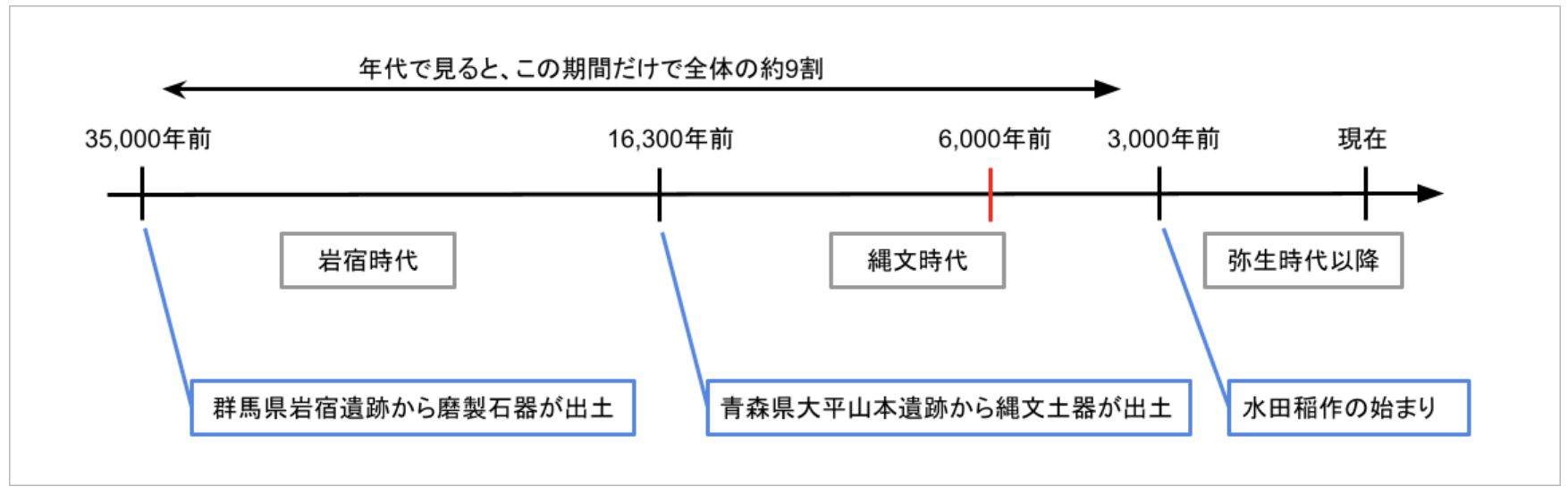 縄文時代は約16,300年前に始まりました。縄文時代は最初に縄文土器が出土してから、水田稲作が始まる弥生時代までの期間を指します。