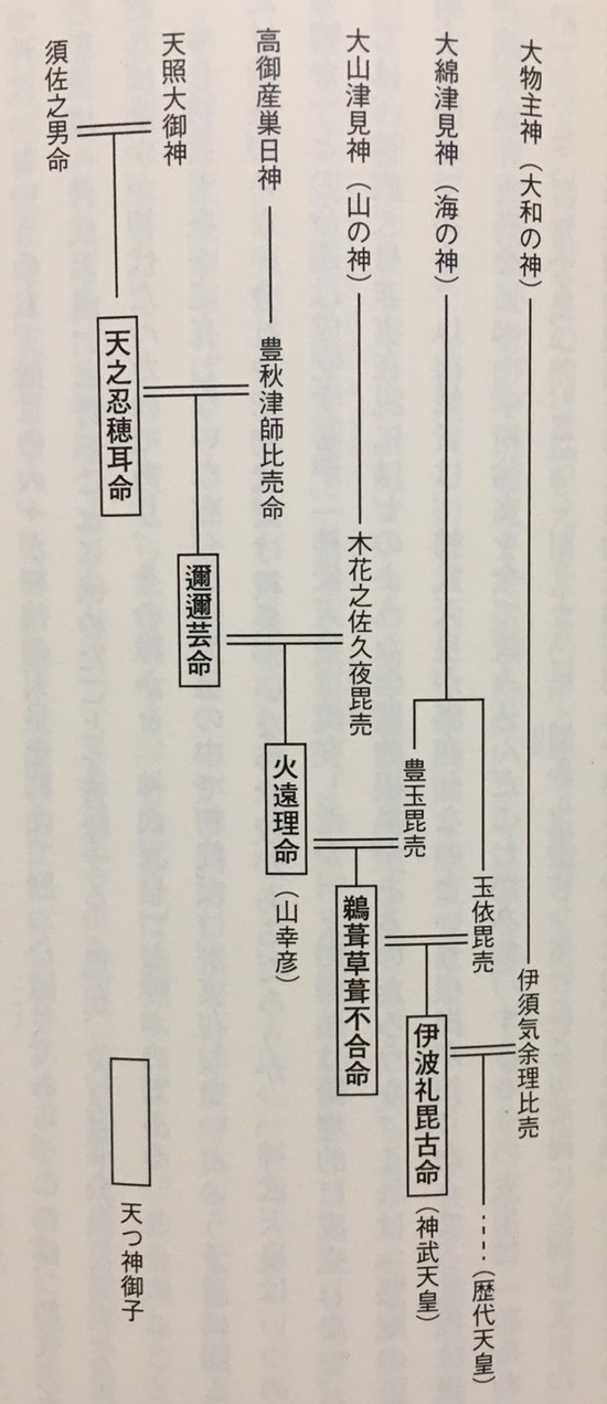 以下の図表は、天つ神御子の婚姻関係図です。伊波礼毘古命(神武天皇)は天照大御神、山の神、海の神の子孫であり、大物主神の義理の息子となりました。
