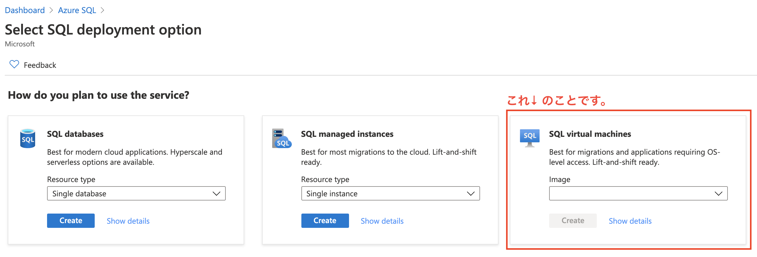 「Azure SQL」というサービスの中に SQL virtual machines がありまして、コンソールからでも構築が可能です。