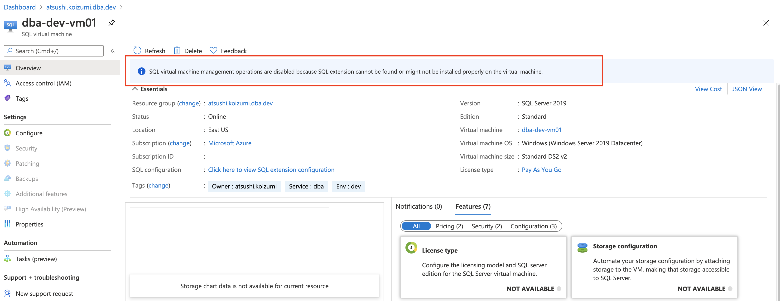私のやり方が間違っていたのか詳しくは分かりませんが、クイックスタートに掲載されているテンプレート作成をそのまま実行すると、失敗してしまいました。作成後の SQL VirtualMachine 画面において以下のようなメッセージが表示されます。