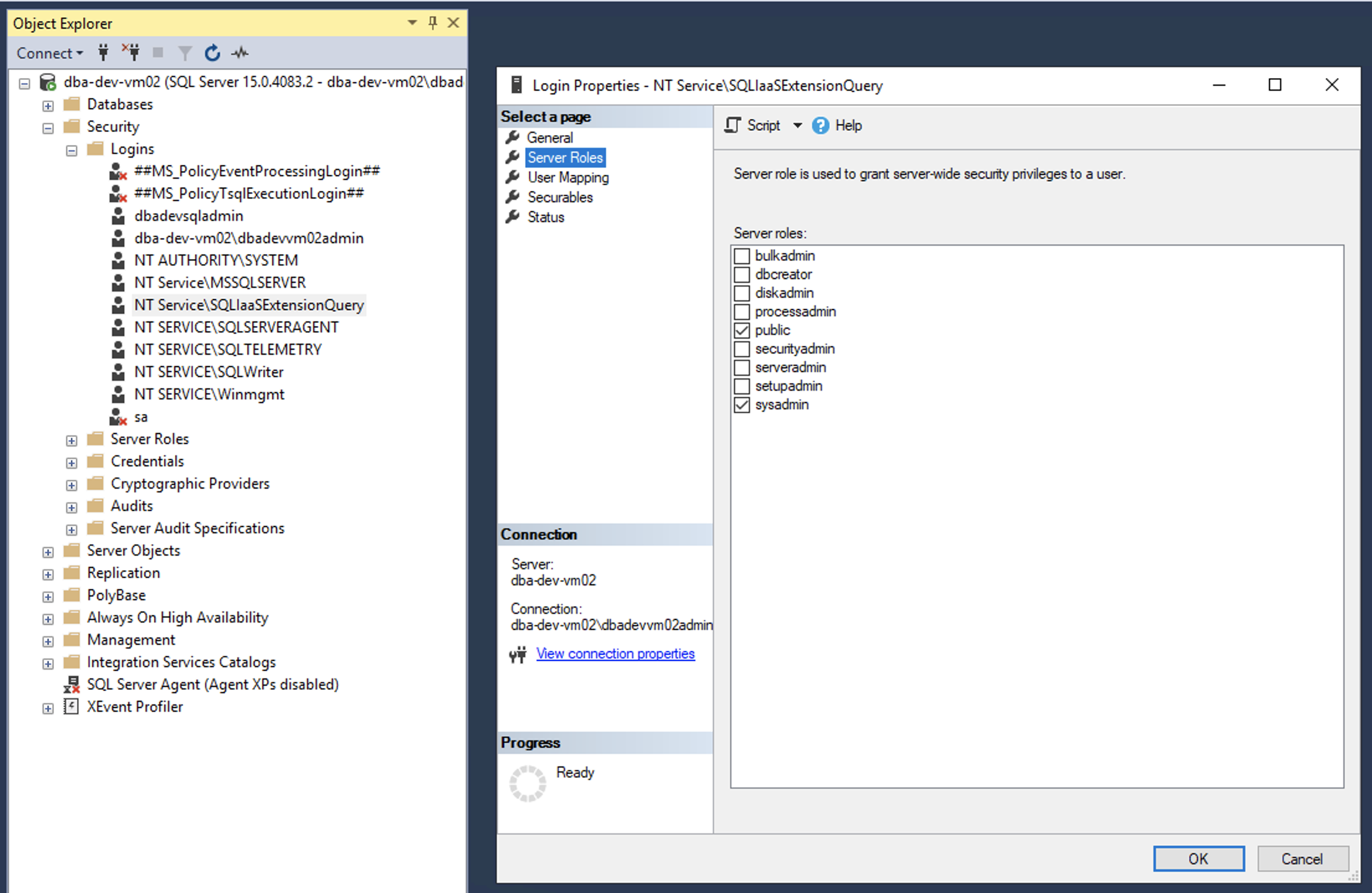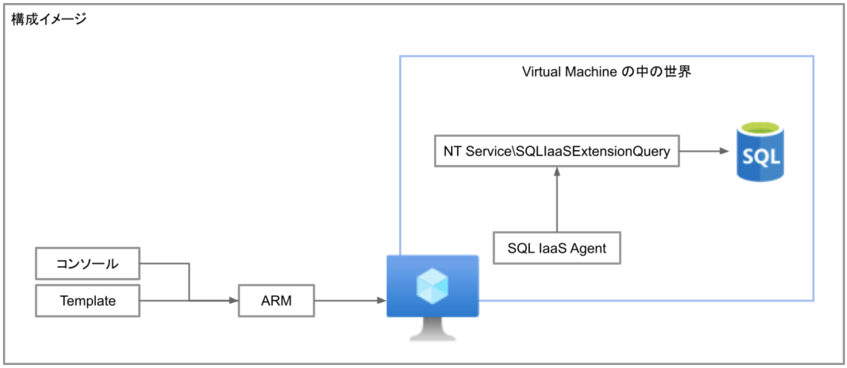 上記のように、コンソールや Template から ARM を介して、サーバーリクエストが送信されます。そして、サーバーにインストールされている SQL IaaS Agent が "NT Service\SQLIaaSExtensionQuery" という sysadmin 権限が付与されているサーバーログインを使って処理を行います。