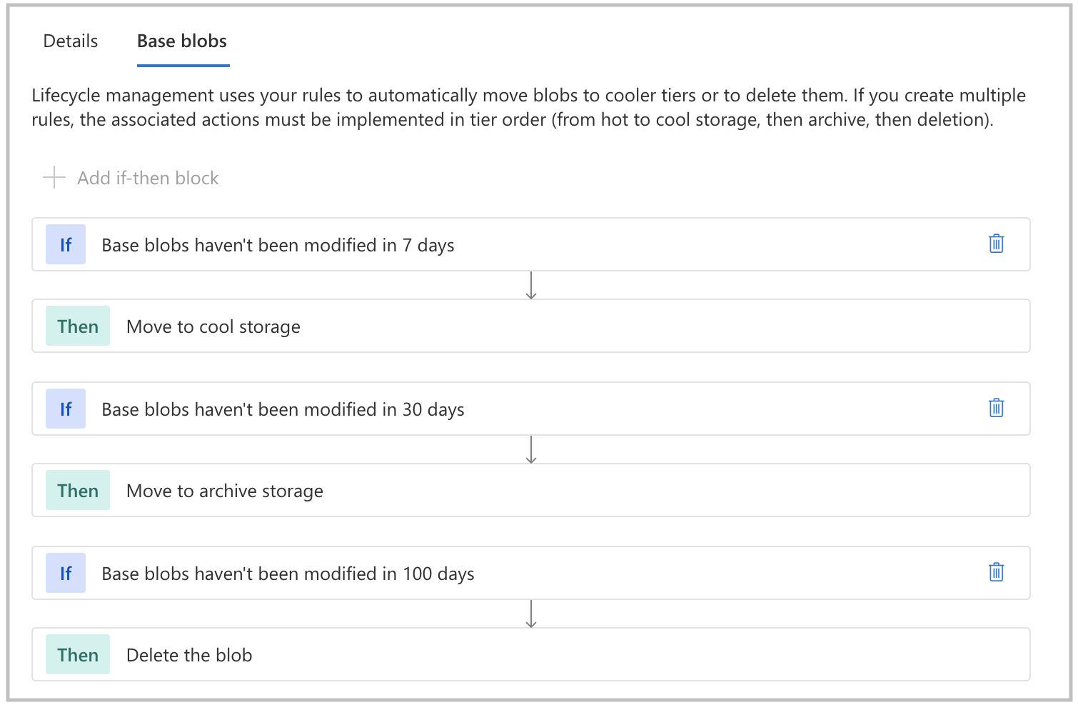 7日後に cool 層へ移動し、30日後に archive 層に移動し、100日後に delete されるというライフサイクルです。