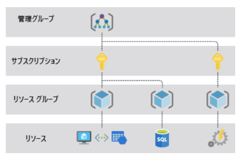 Azure には、管理グループ、サブスクリプション、リソース グループ、およびリソースという4つのレベルのスコープが用意されています。