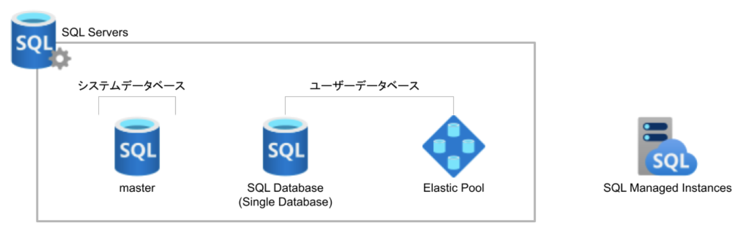 SQL Servers というリソース(インスタンス)を構築し、その上に SQL Database(Single Database) と Elastic Pool を構築することができます。そして、それとは全く別で、Managed Instance は単独で SQL Server を使えるサービスとなっています。