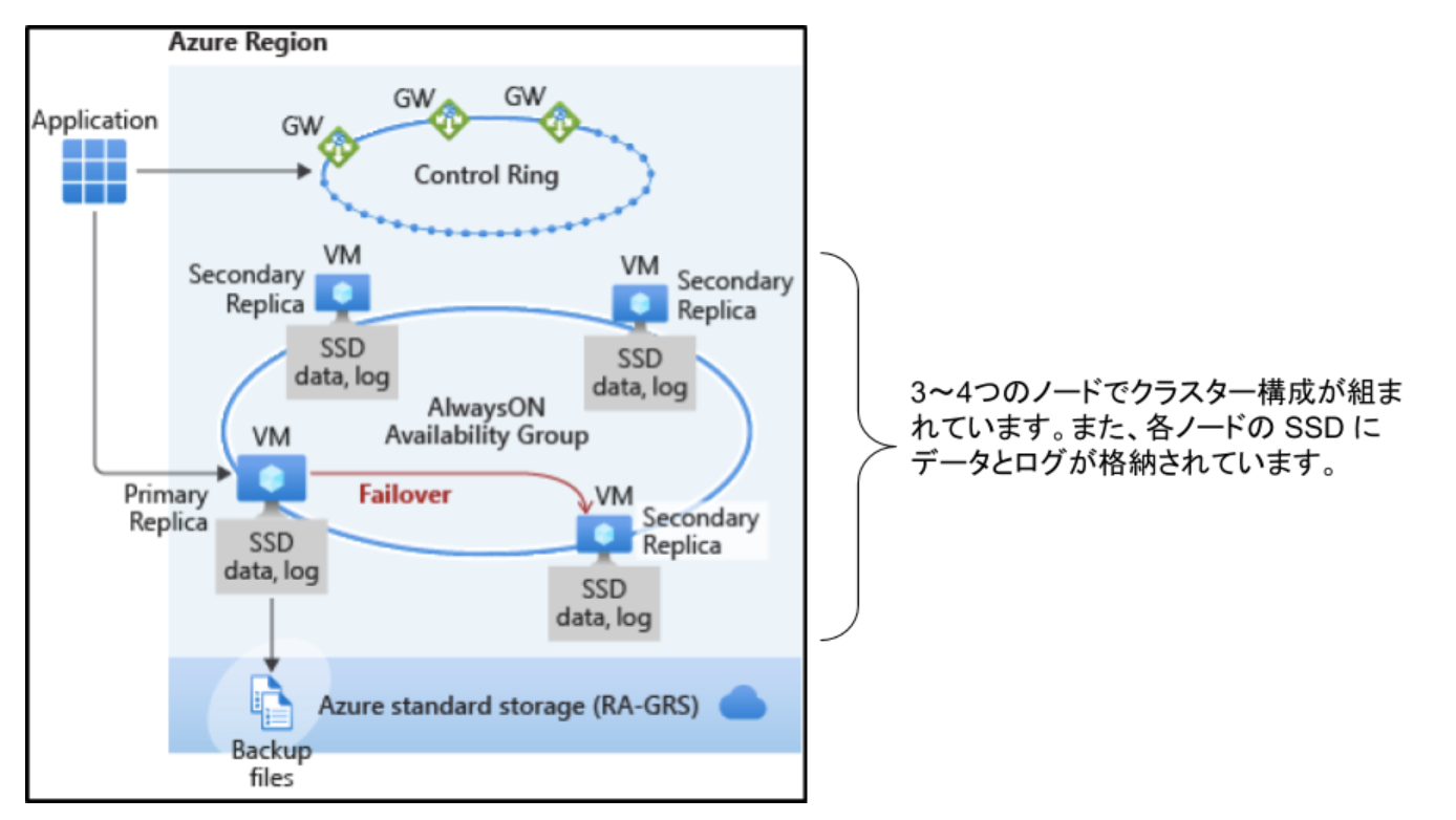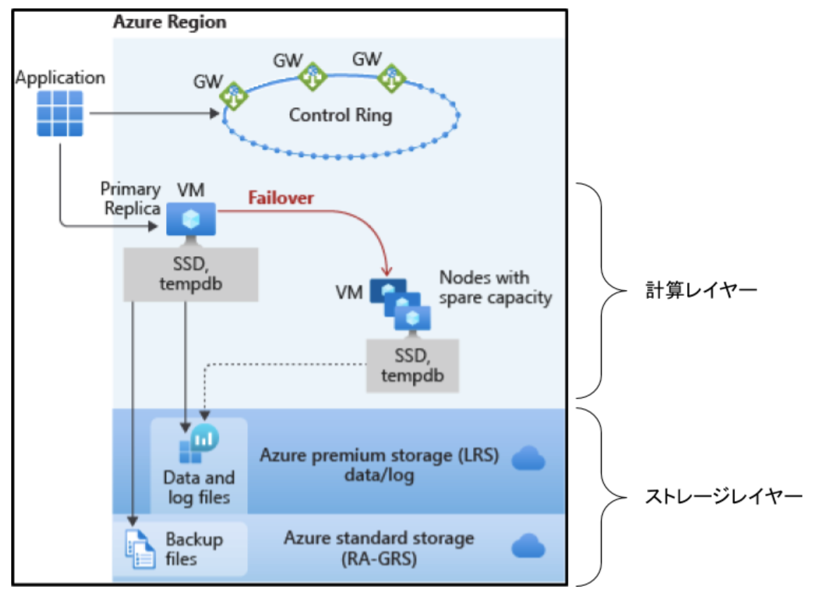計算レイヤーはローカルでフェールオーバーする仕組みとなっていて、データレイヤー(ログファイルとデータファイル)は Azure Premiun Storage の LRS(ローカル冗長ストレージ)に配置されています。