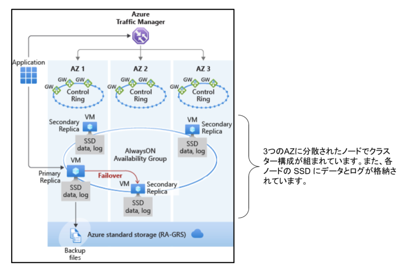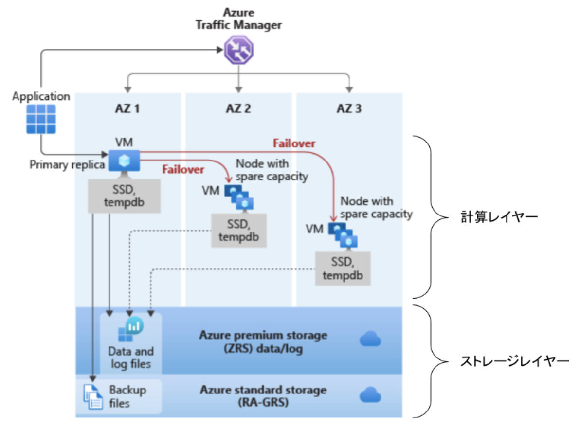 計算レイヤーは3つのゾーンでフェールオーバーする仕組みとなっていて、データレイヤー(ログファイルとデータファイル)は Azure Premiun Storage の ZRS(ゾーン冗長ストレージ)に配置されています。