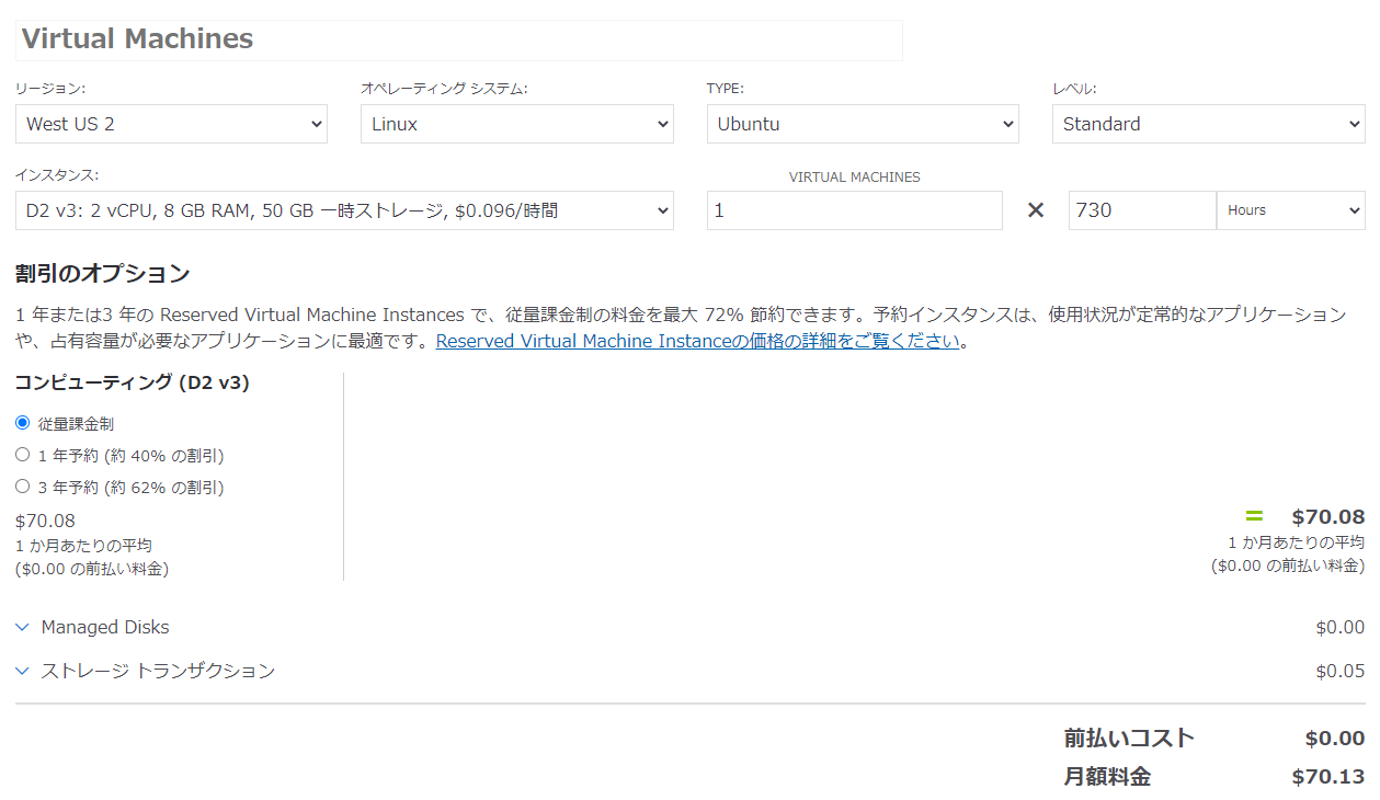 私が一番触ることが多いのは、VirtualMachine と Azure Databaase です。実際に公式サイトで1か月の料金を見積もりをしてみましたので貼っておきます。
