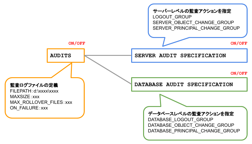 SQLServer の監査機能の難しいところは、Audits と Specification という存在です。図で表してみます。