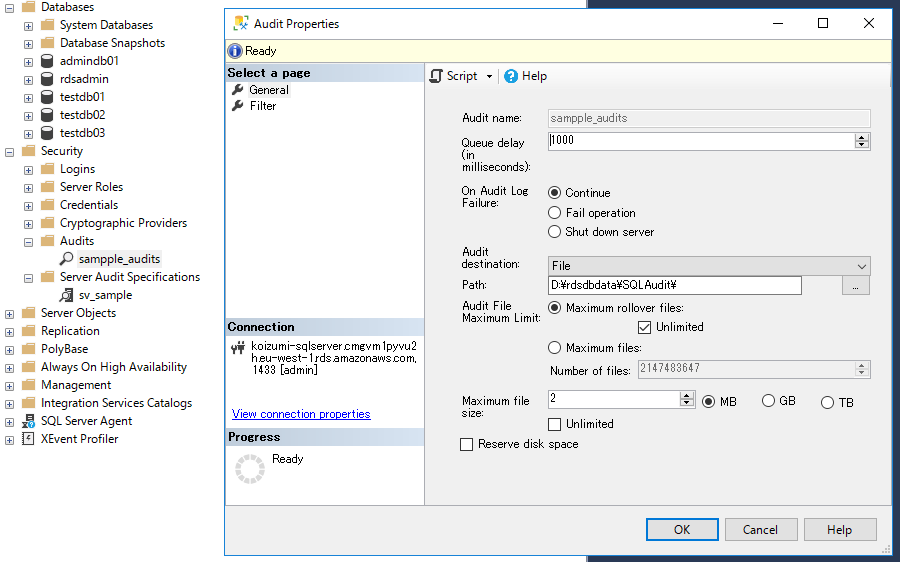 上記の T-SQL では監査ログファイルを生成するにあたって、2MB を超えたら新しいログファイルにスイッチするように設定しています。ファイル数の上限は 2147483647 に設定しています。