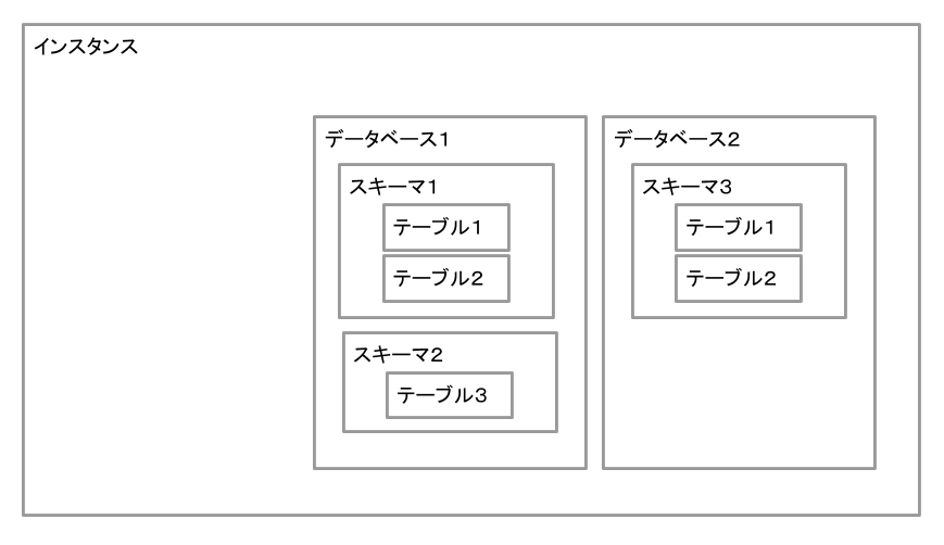 インスタンス、データベース、スキーマ、テーブルとの関係です。