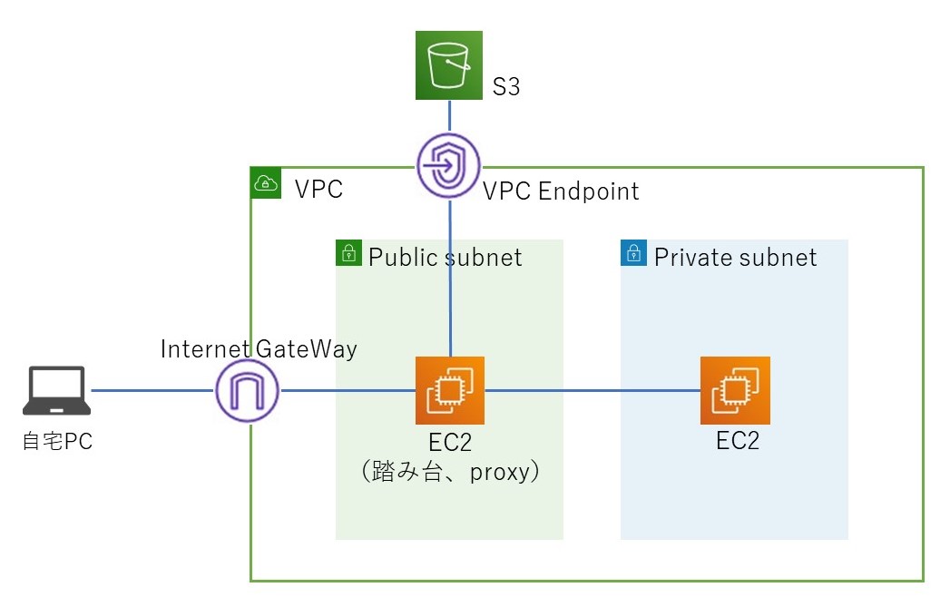 • プライベートサブネットから外部インターネットへのアクセスは、パブリックサブネットのEC2(proxy)を必ず経由する。