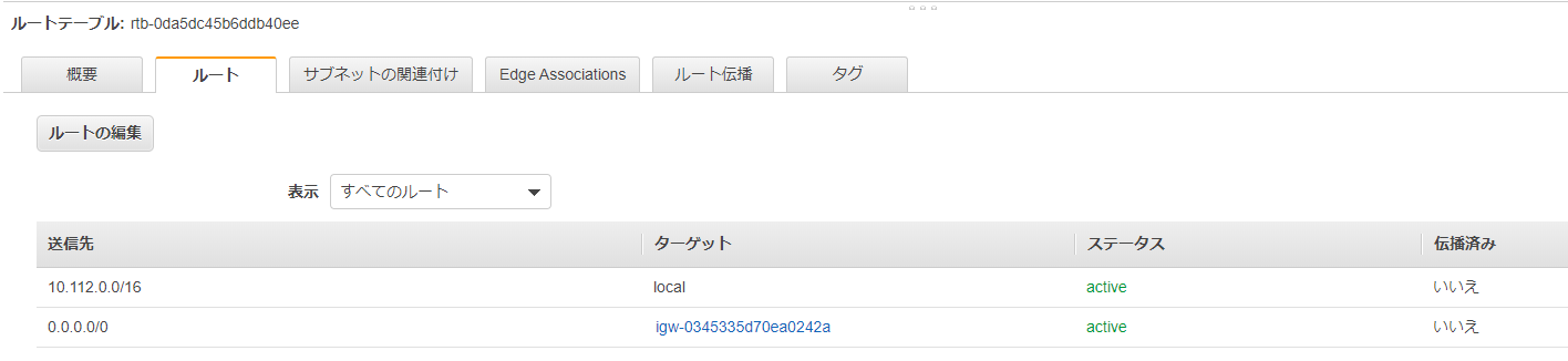 後者の通信を可能とするのが、VPCエンドポイントです。こちらはすでに設定済みですね。改めて、パブリックサブネットのルートテーブルを参照してください。