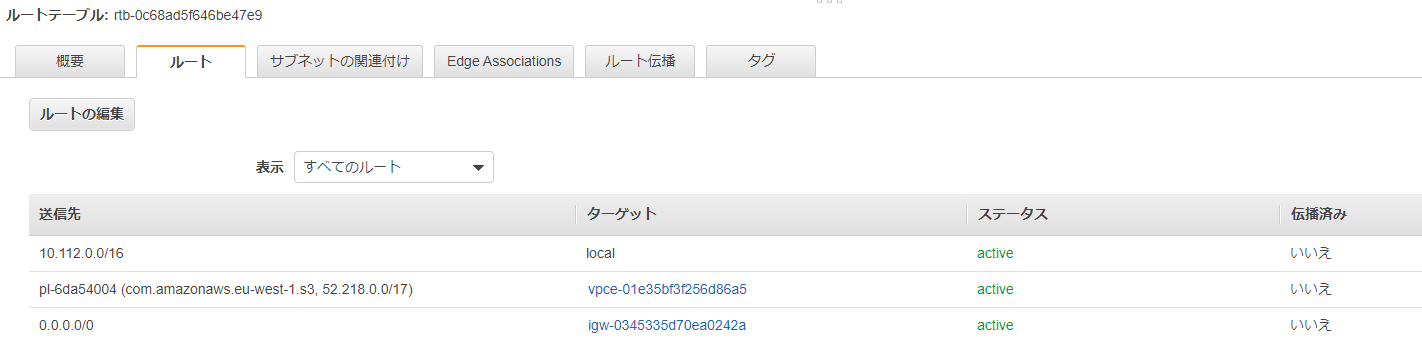 S3のVPCエンドポイントがルートテーブルに記述されていれば問題ありません。ネットワークの設定はこれで完了です。