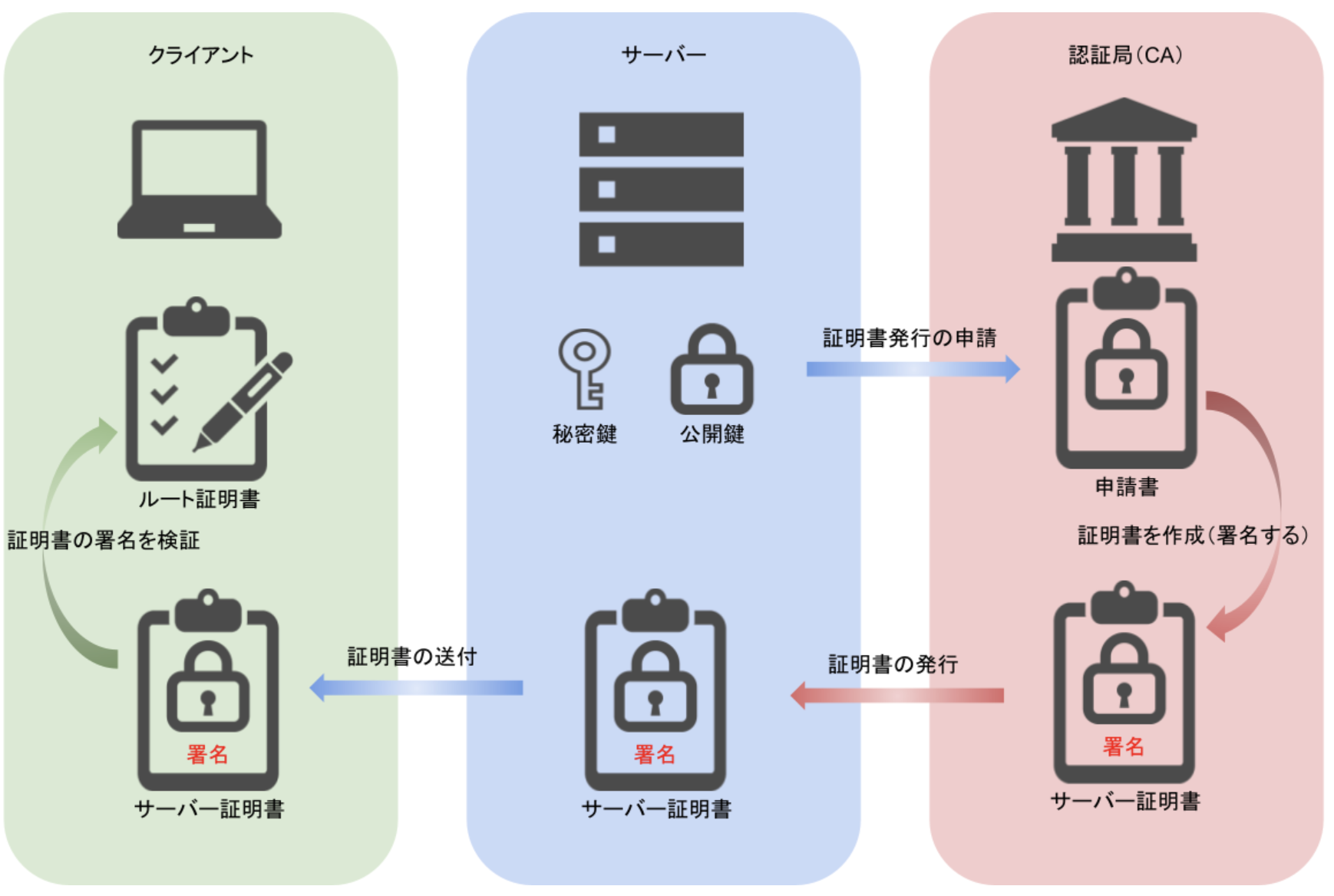 - 署名がルート証明書の内容と合致すると判断されれば、サーバーが本物であると判定される。