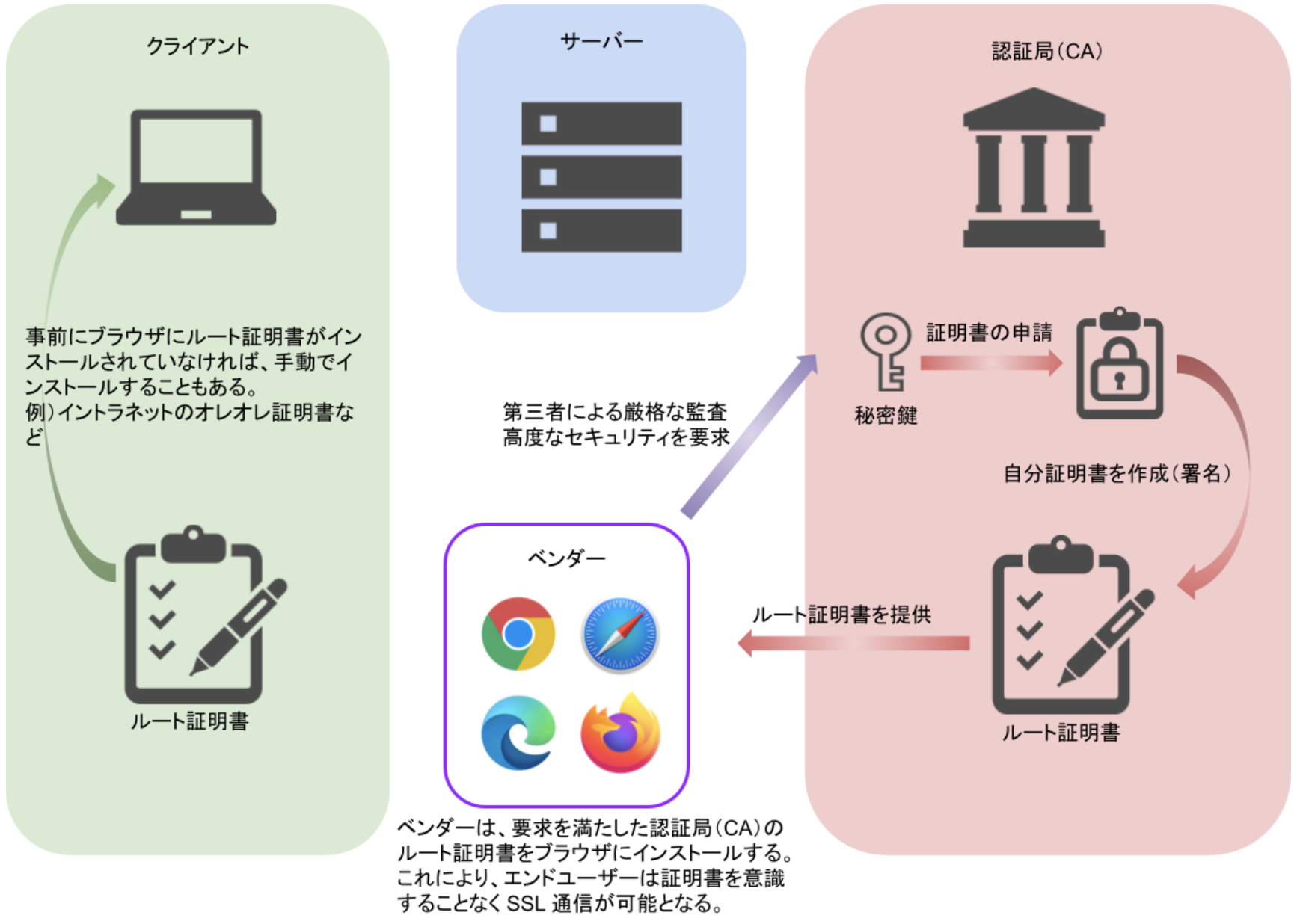 - クライアントからサーバーに通信するとき、サーバー証明書の署名をルート証明書を使って検証する。