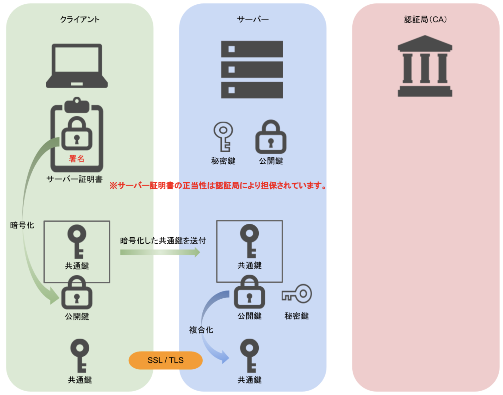 - 共通鍵を使ってクライアントとサーバー間でSSL通信が可能となります。