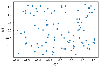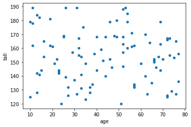 df.plot(x="age",y="tall",kind='scatter') # 散布図で表示